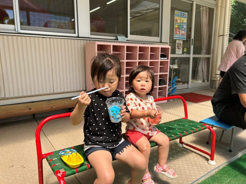 梅ジュースは満三歳児・年少組が園庭の梅で作った梅シロップを使用しました。